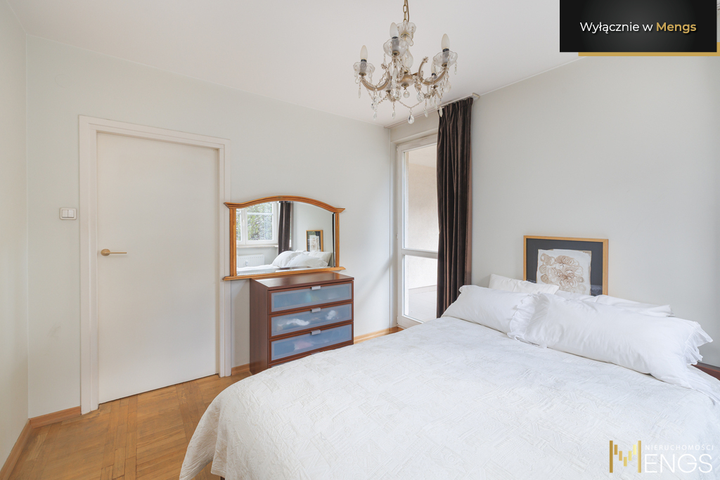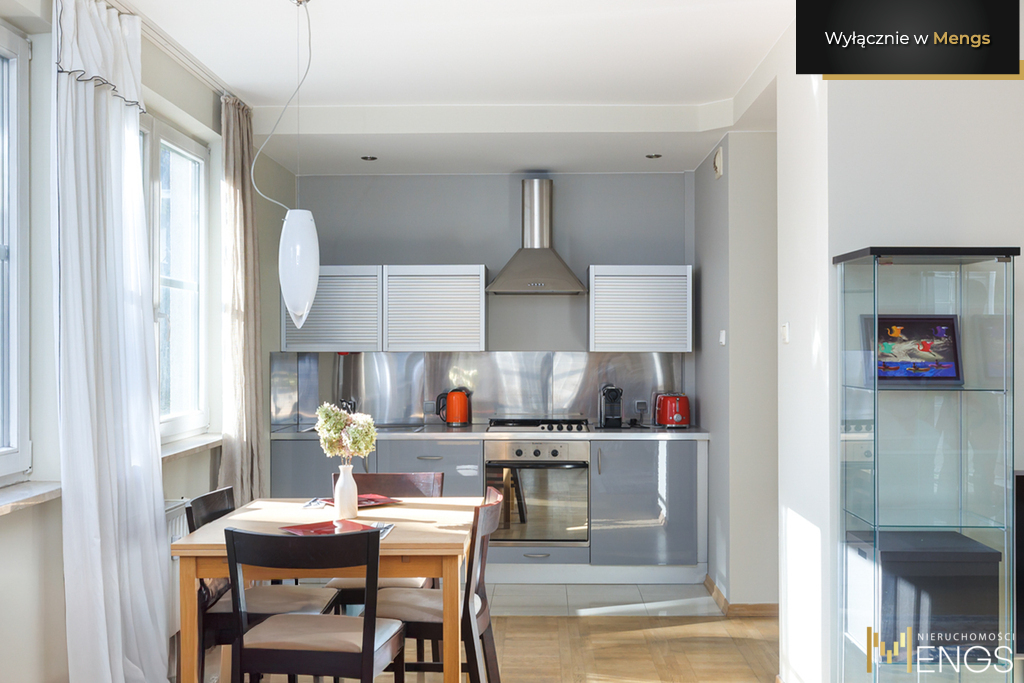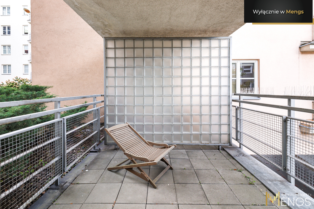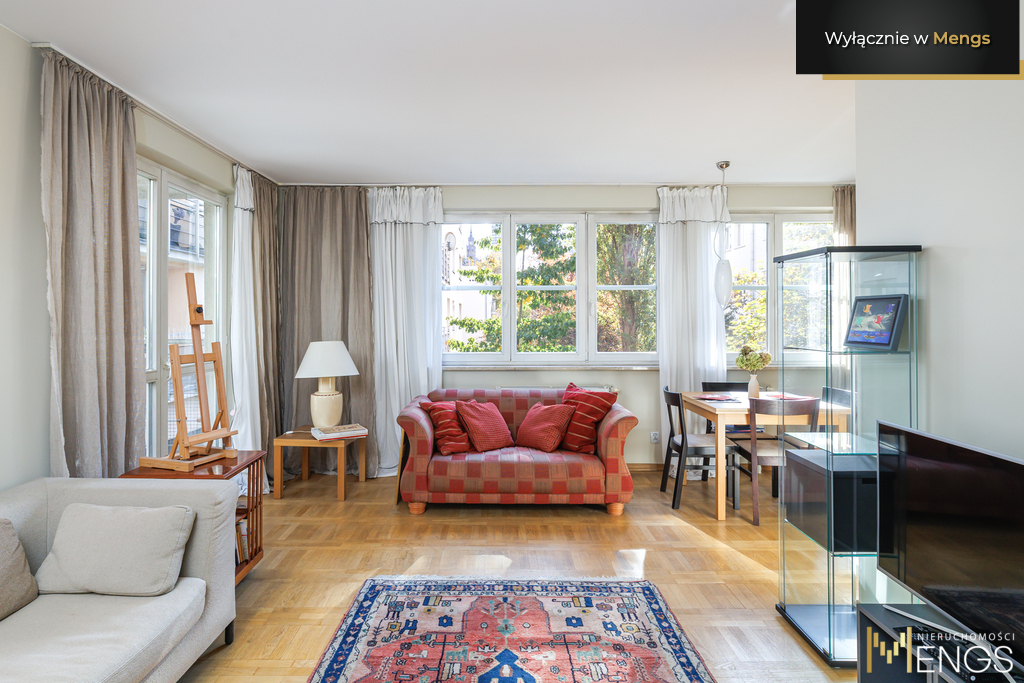 Okna mieszkania wychodzą na wewnętrzny, spokojny dziedziniec z widokiem na zieleń, Pałac Kultury i Nauki oraz warszawskie wieżowce.