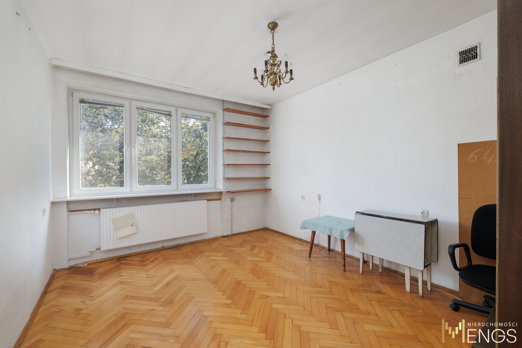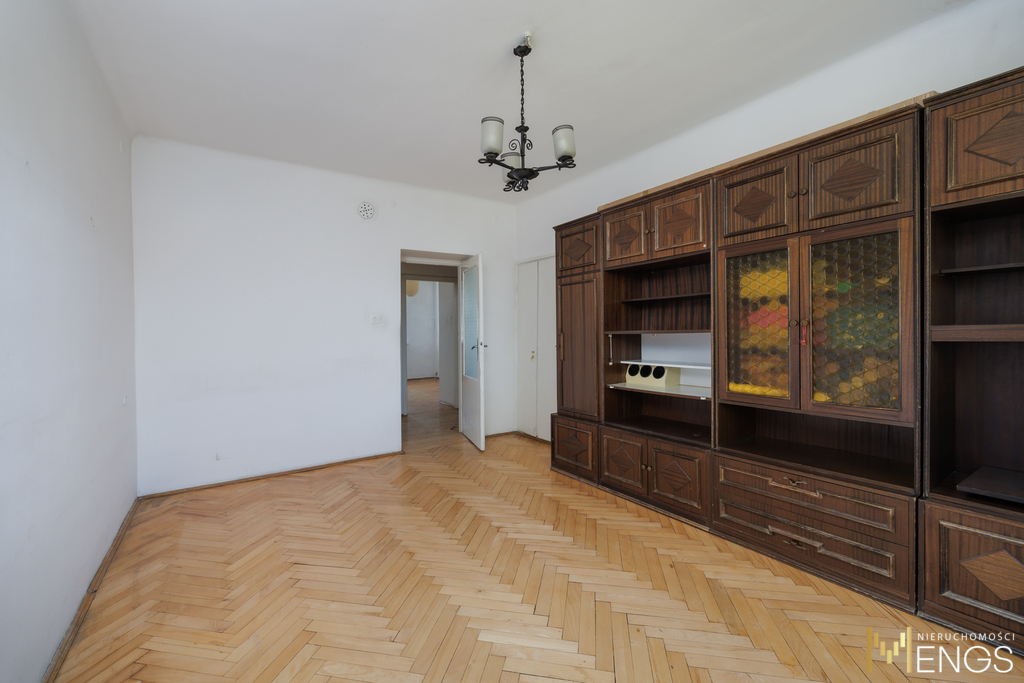 W całym mieszkaniu zachował się oryginalny drewniany parkiet, który po renowacji może dodać całości wyjątkowego charakteru.