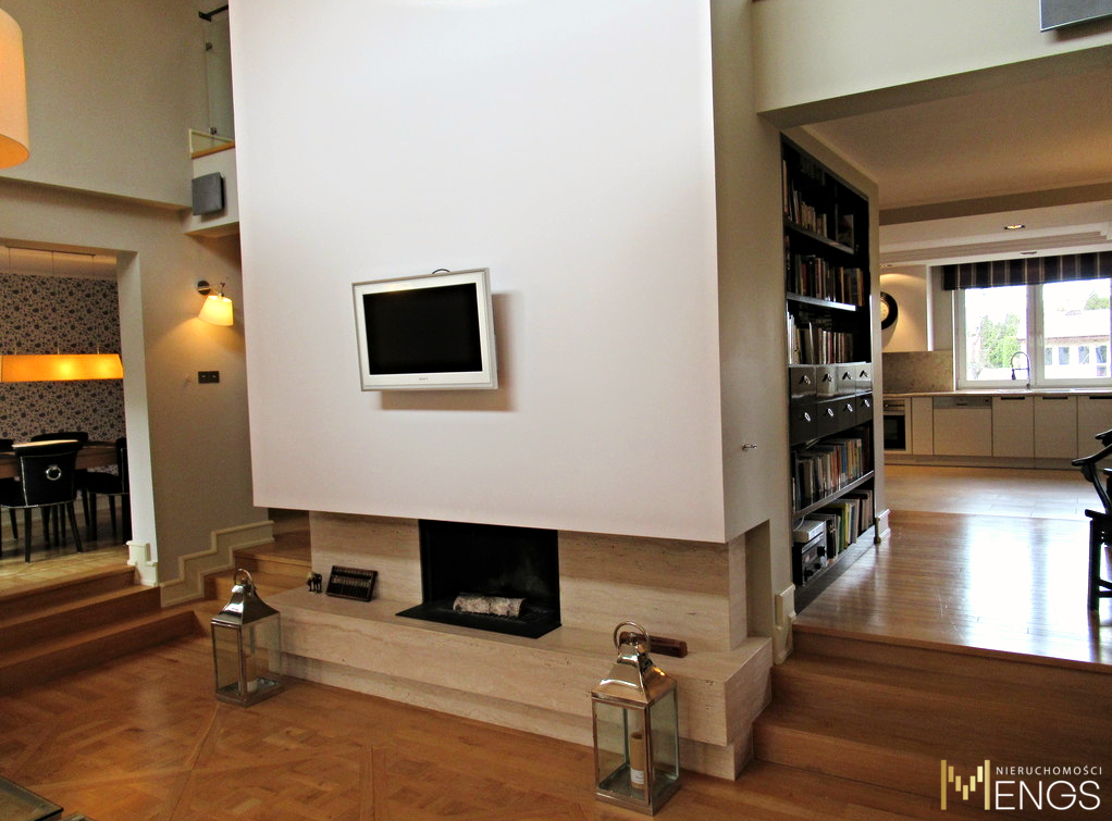 – salon ok. 36,00 m2 (wysokość ponad 5 m), kominek w trawertynie